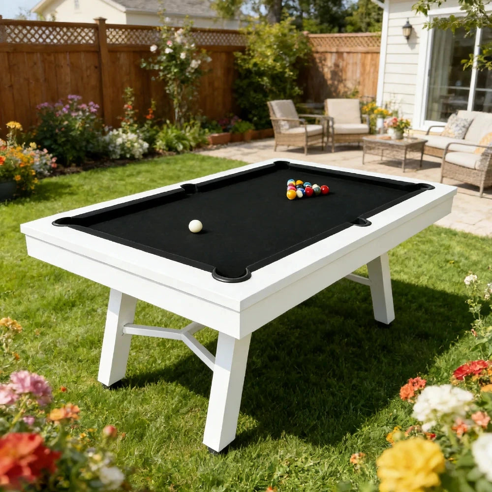 CUETIQ 7FT Outdoor Pool Table - Slanted Leg Design Metal Frame Waterproof Billiard Table for Backyard Patio Games - White & Black
