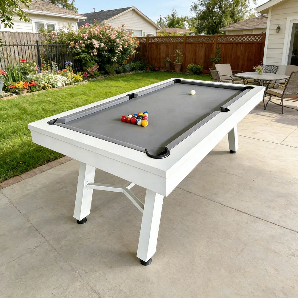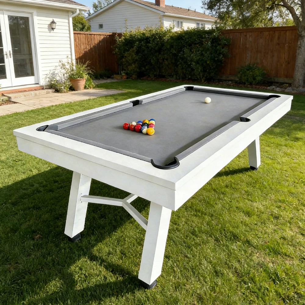 CUETIQ 7FT Outdoor Pool Table - Slanted Leg Design Metal Frame Waterproof Billiard Table for Backyard Patio Games - White & Grey