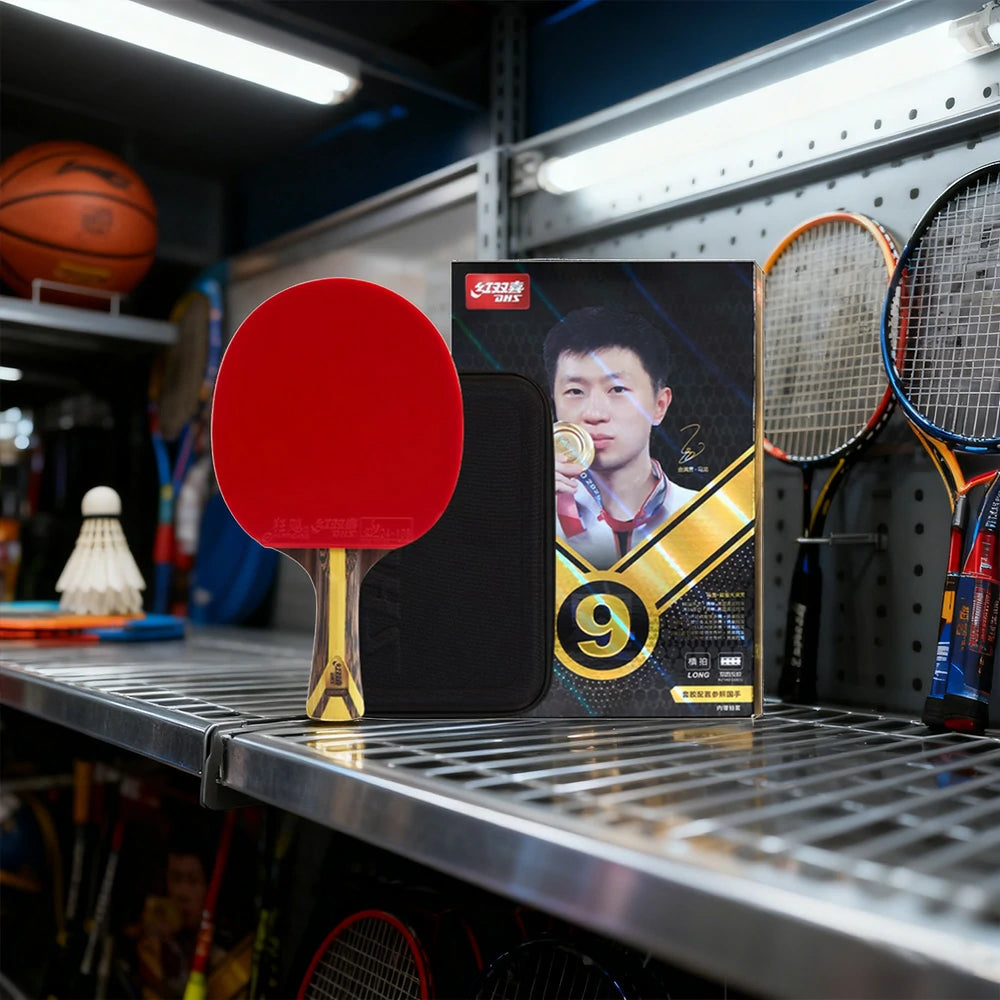 DHS 9-Star Shakehand Table Tennis Paddle Set - Carbon Power, Strong Spin & Speed, Includes 6 Balls & Case - Red