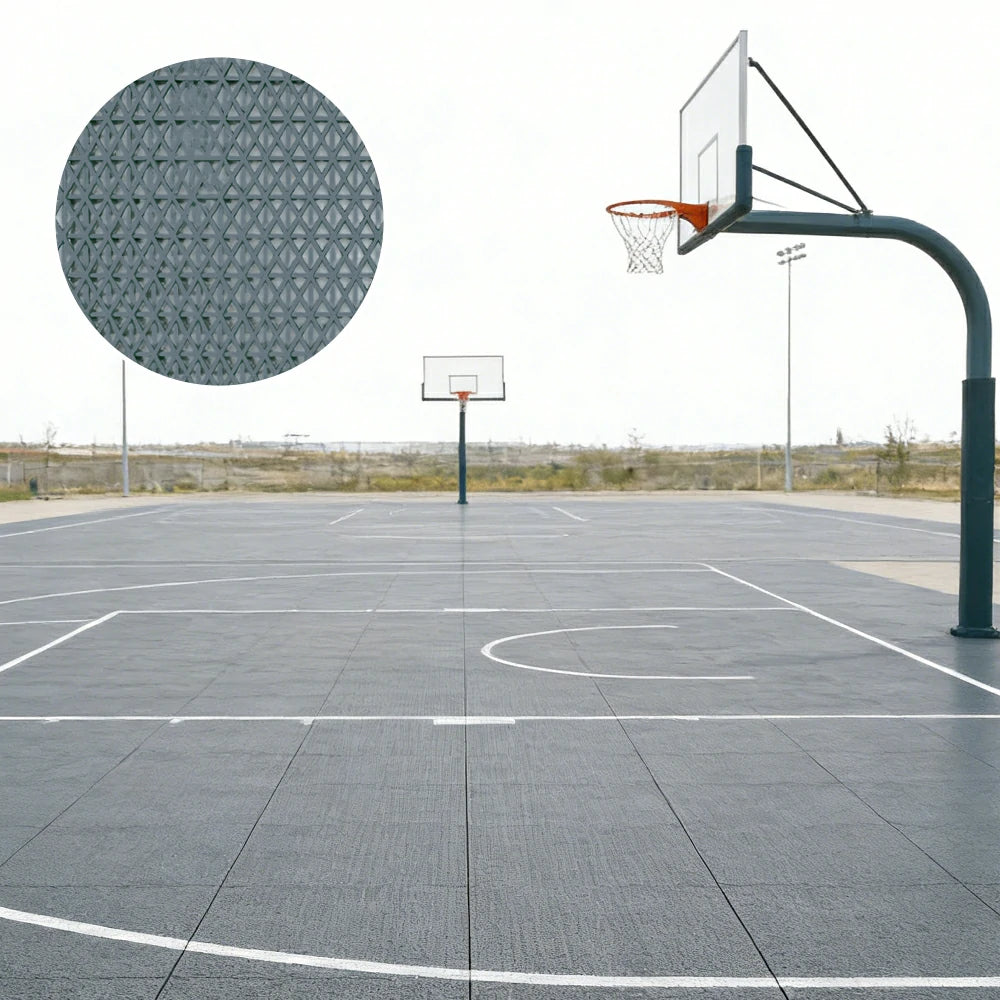 Interlocking modular sports flooring tiles designed for durability, stability, and comfort. The double-layer structure improves rigidity and rebound performance while maintaining a reliable anti-slip surface, making it ideal for basketball courts, school playgrounds, sports training areas, and temporary event venues.