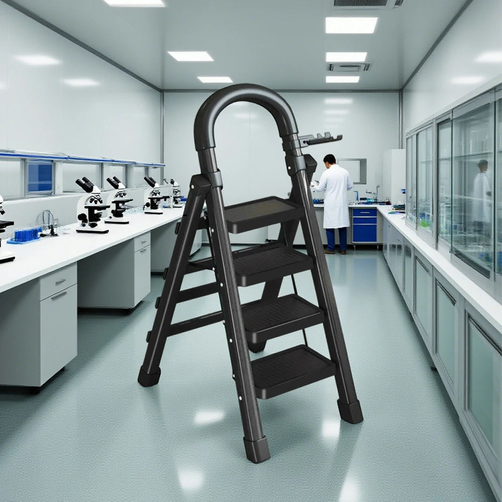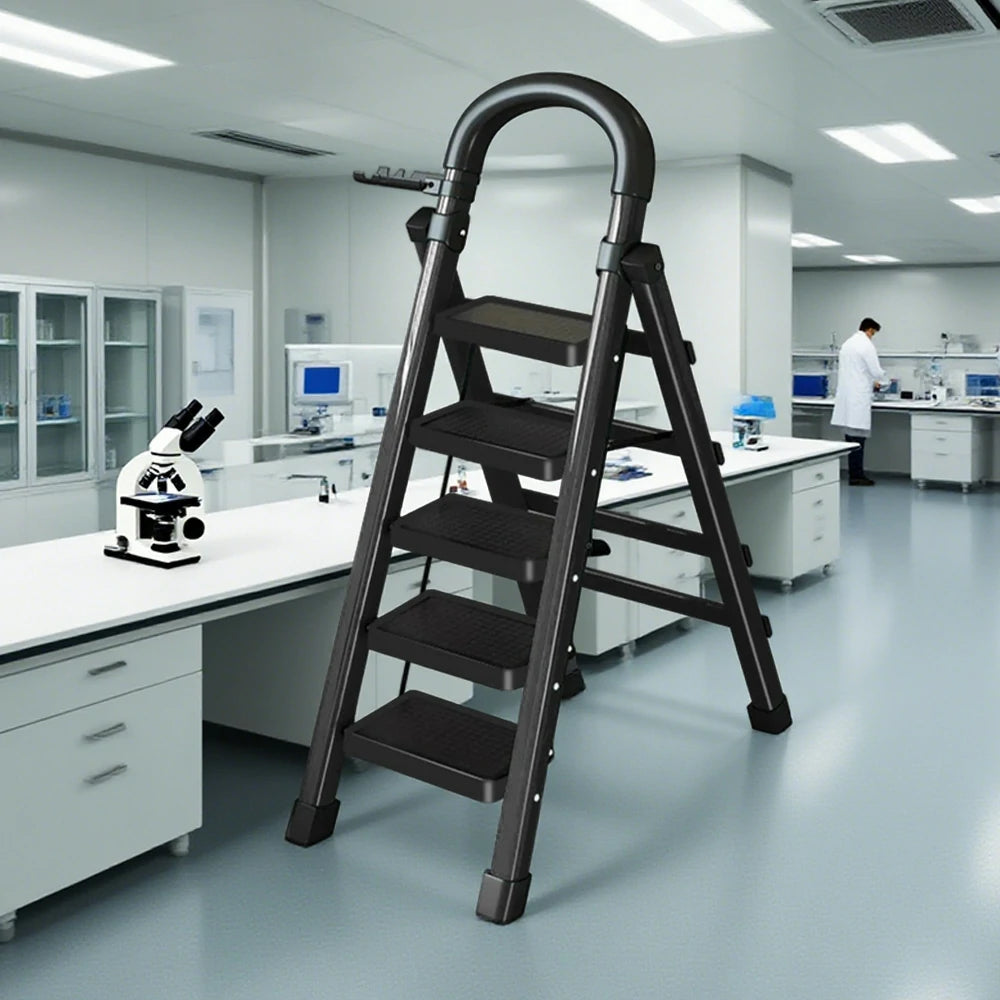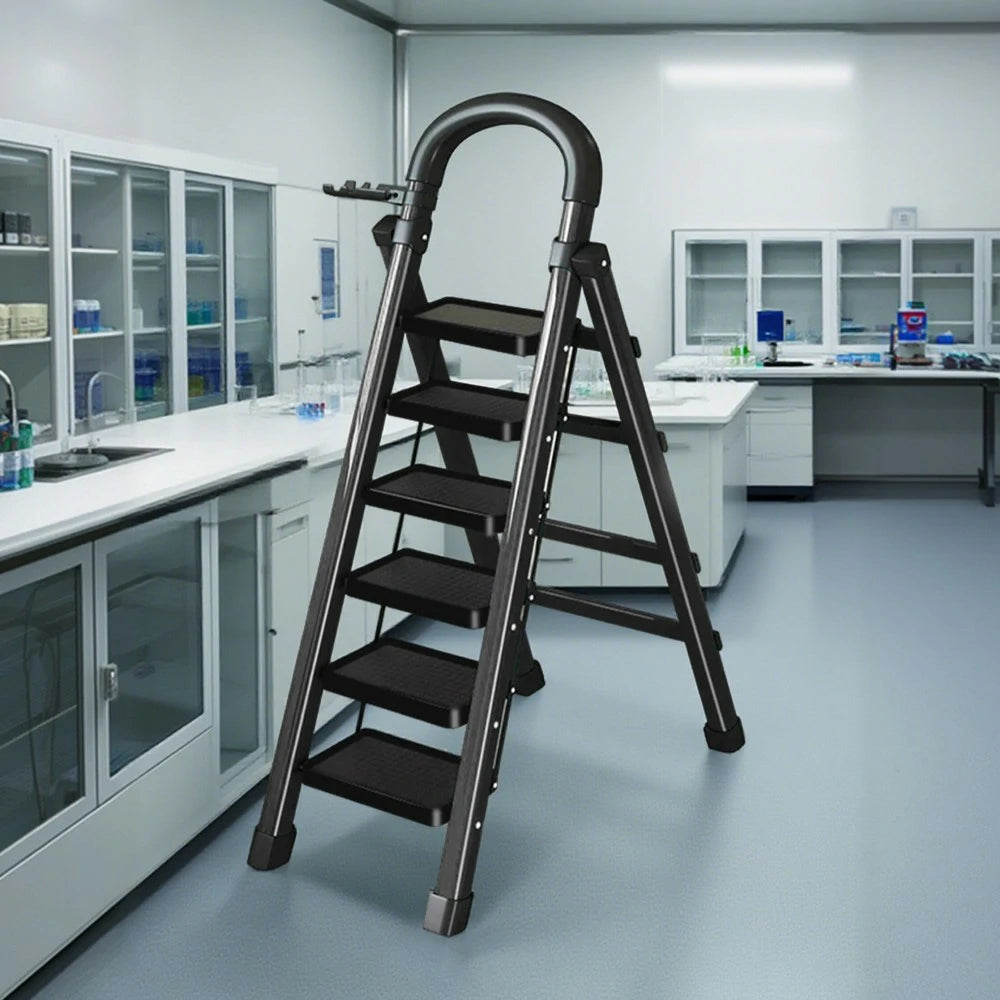 GROVIA 4/5/6 Step Carbon Alloy Steel Folding Ladder, Extra-Wide 27cm Pedals, Tool Tray, Anti-Slip Feet, Heavy-Duty Design - Black