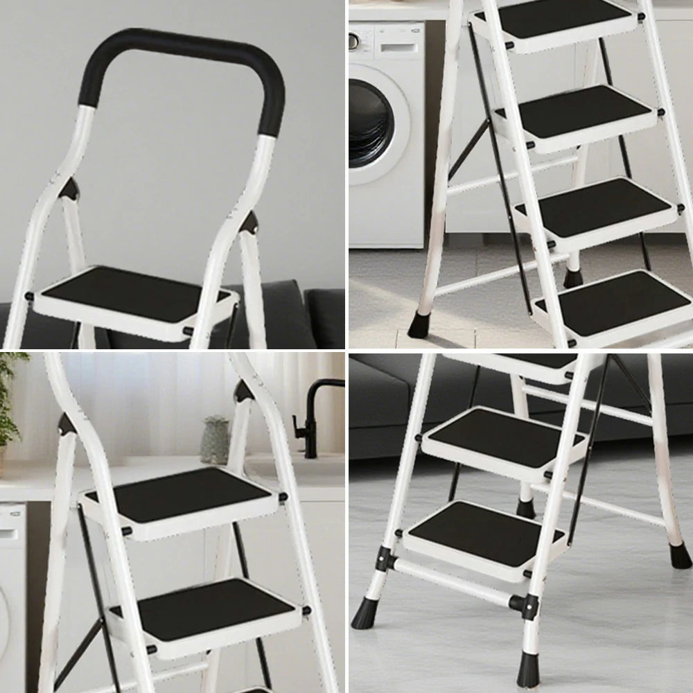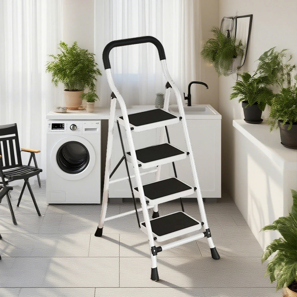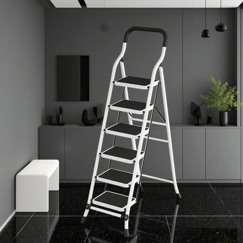 GROVIA 4/5/6-Step Carbon Steel Slim Folding Ladder - 7cm Thick, 26cm Non-Slip Pedal, Stable Anti-Slip Feet - White