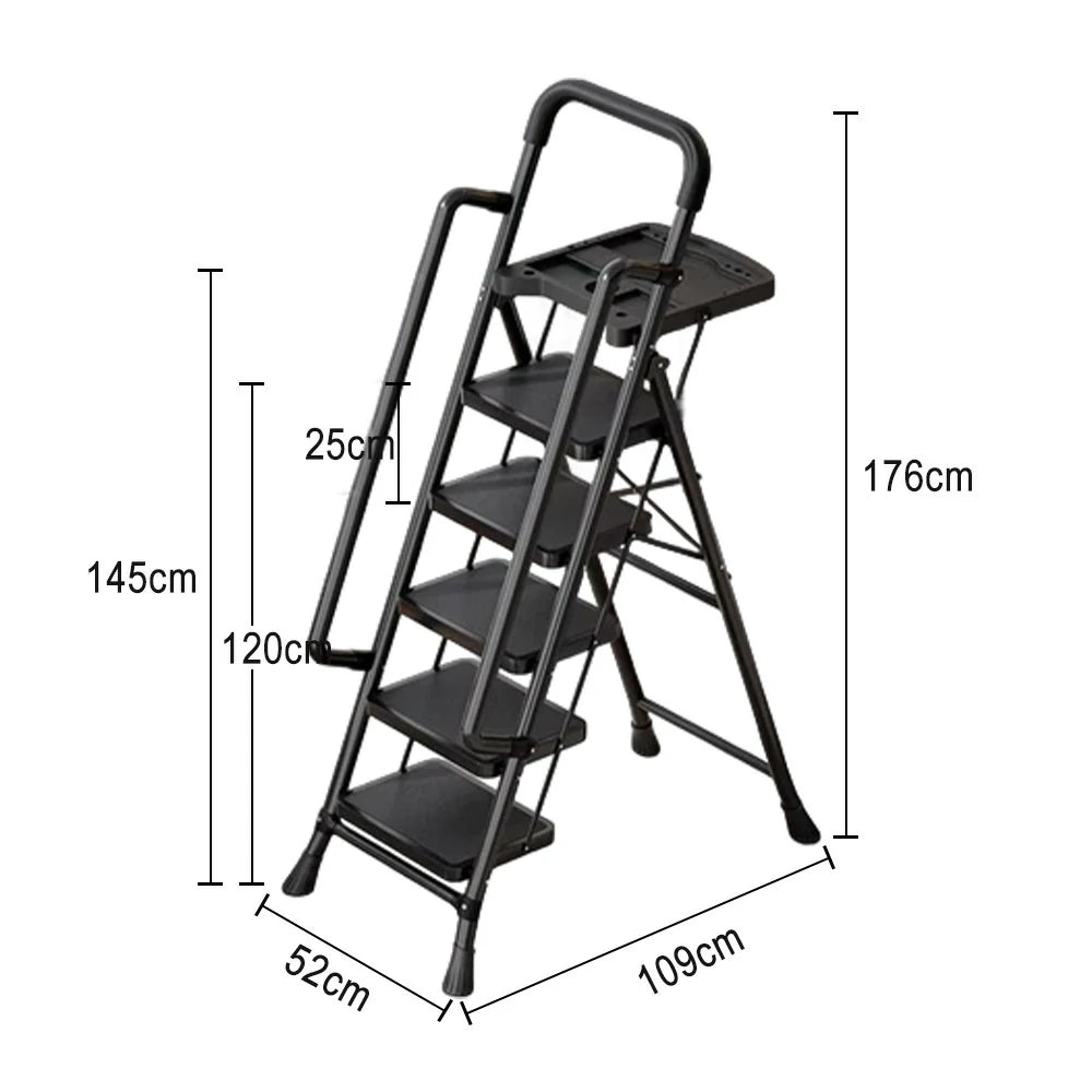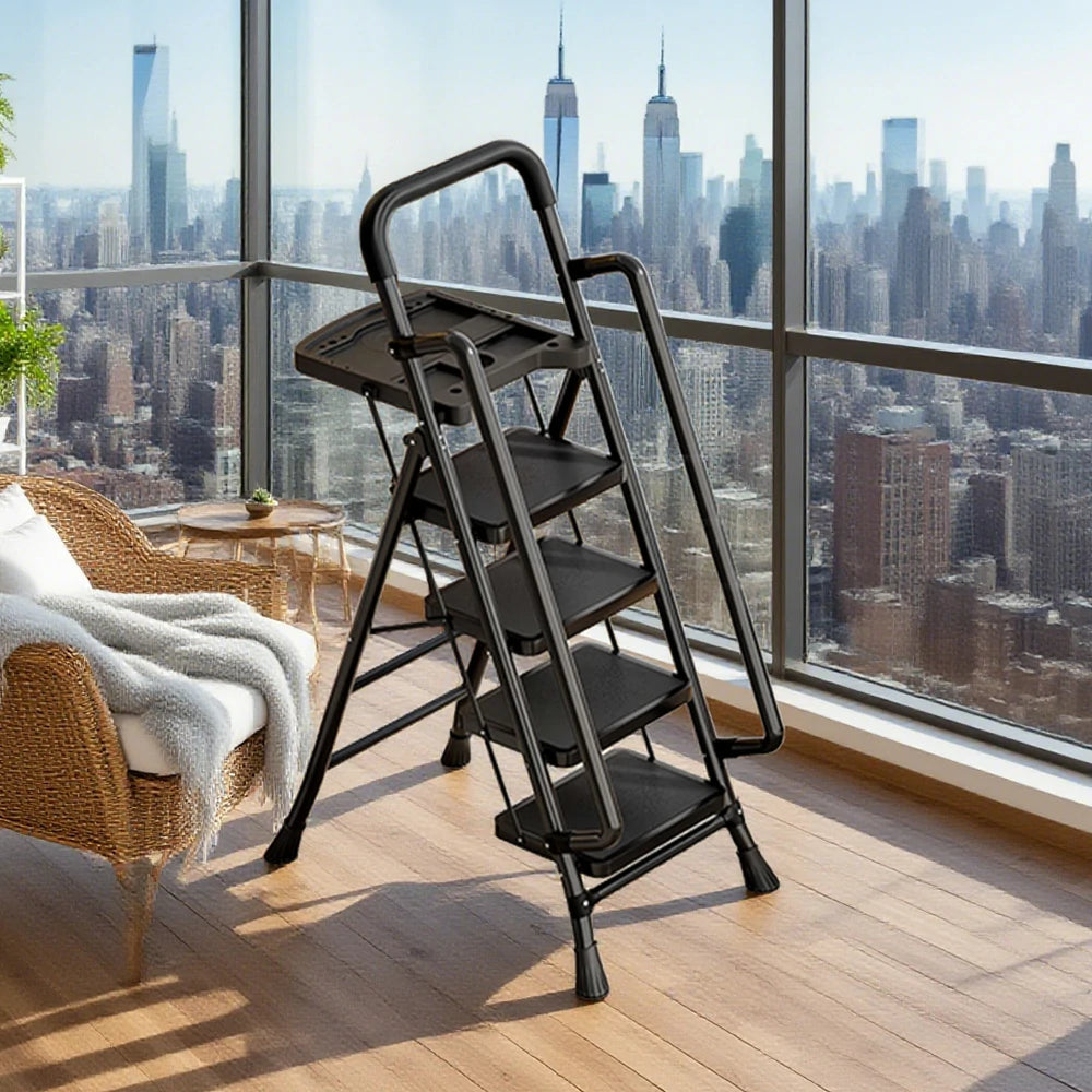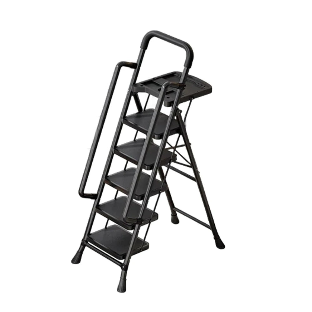 GROVIA 4/5/6 Step Carbon Steel Folding Handrail Ladder - Tool Tray, 26cm Wide Pedals, Foldable to 10cm, Anti-Slip Feet - Black