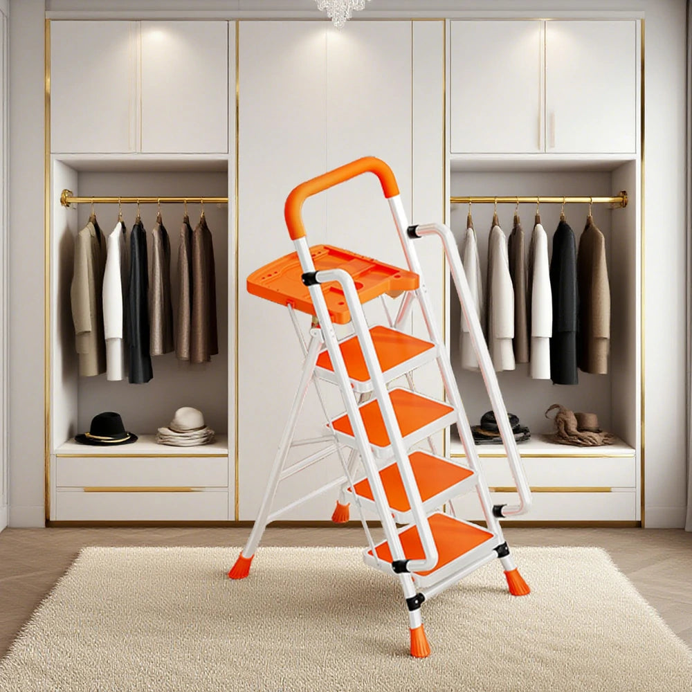 GROVIA 4/5/6 Step Carbon Steel Folding Handrail Ladder - Tool Tray, 26cm Wide Pedals, Foldable to 10cm, Anti-Slip Feet - Orange