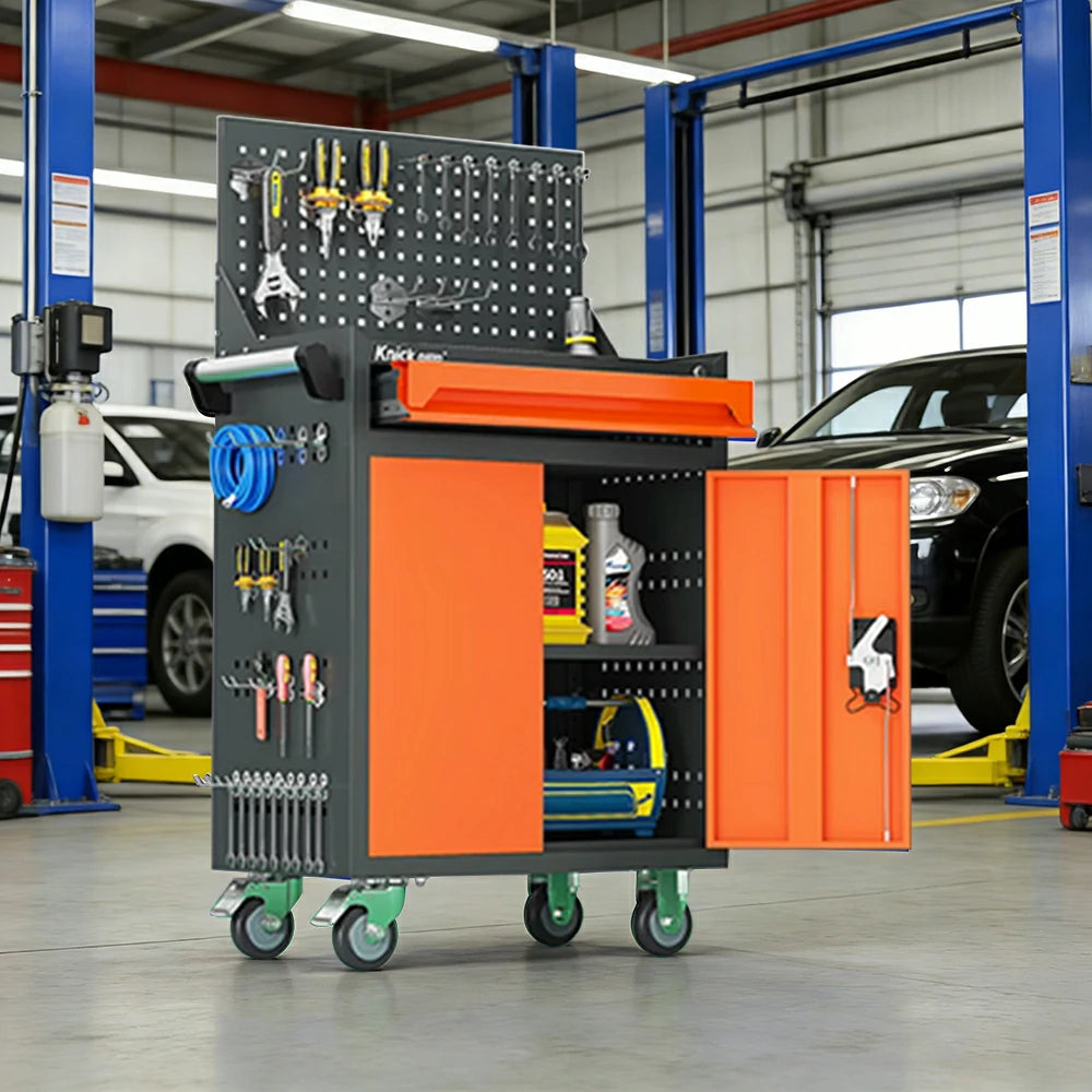 GROVIA Mobile Tool Trolley with Pegboard - Single Drawer Design, Heavy-Duty Steel Cabinet, Lockable Storage for Workshop & Garage - Orange
