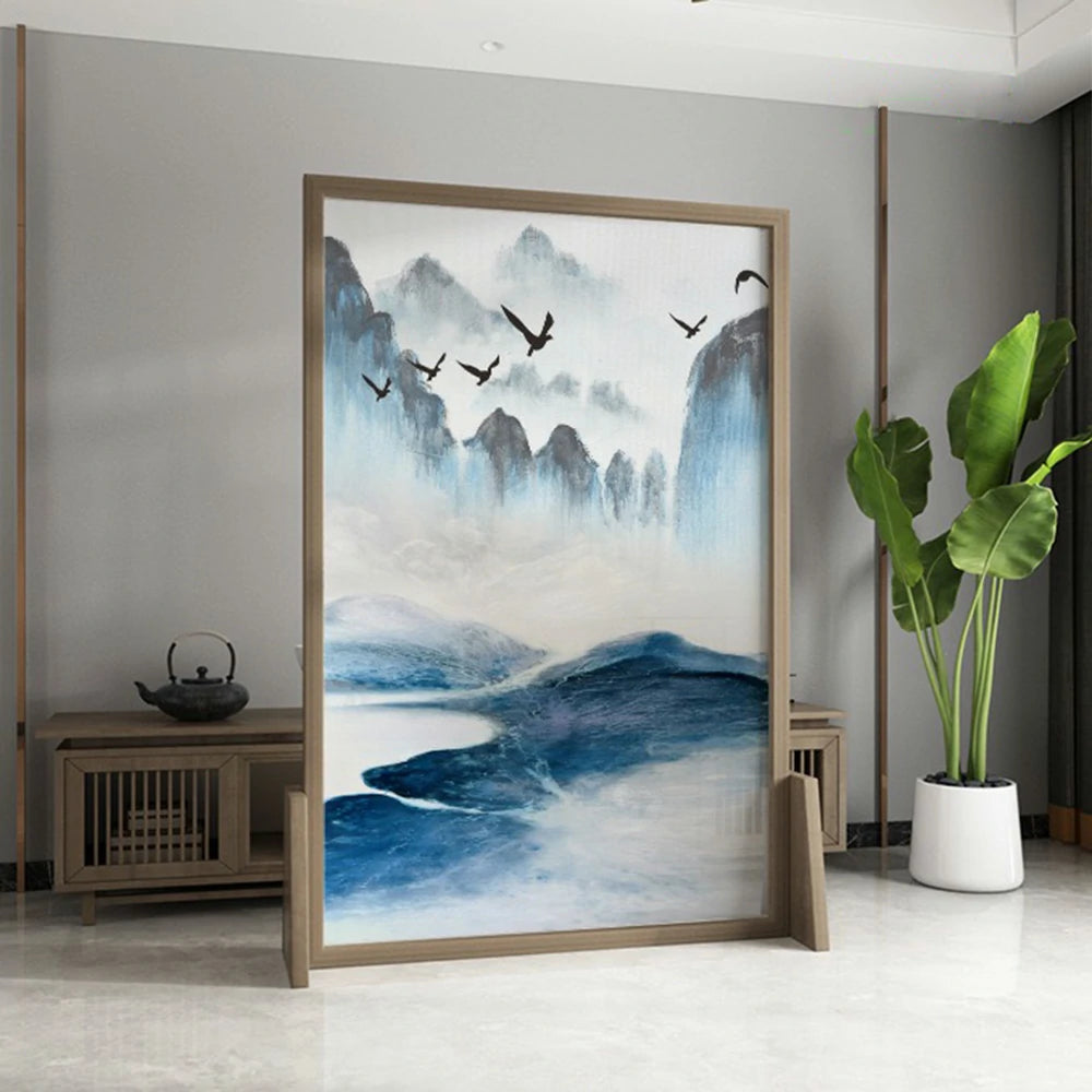 LIVARA Blue landscape Pattern Screen Made Of Solid Wood White Wax Wood And Mongolian Pine With An Eastern Style Home Decoration