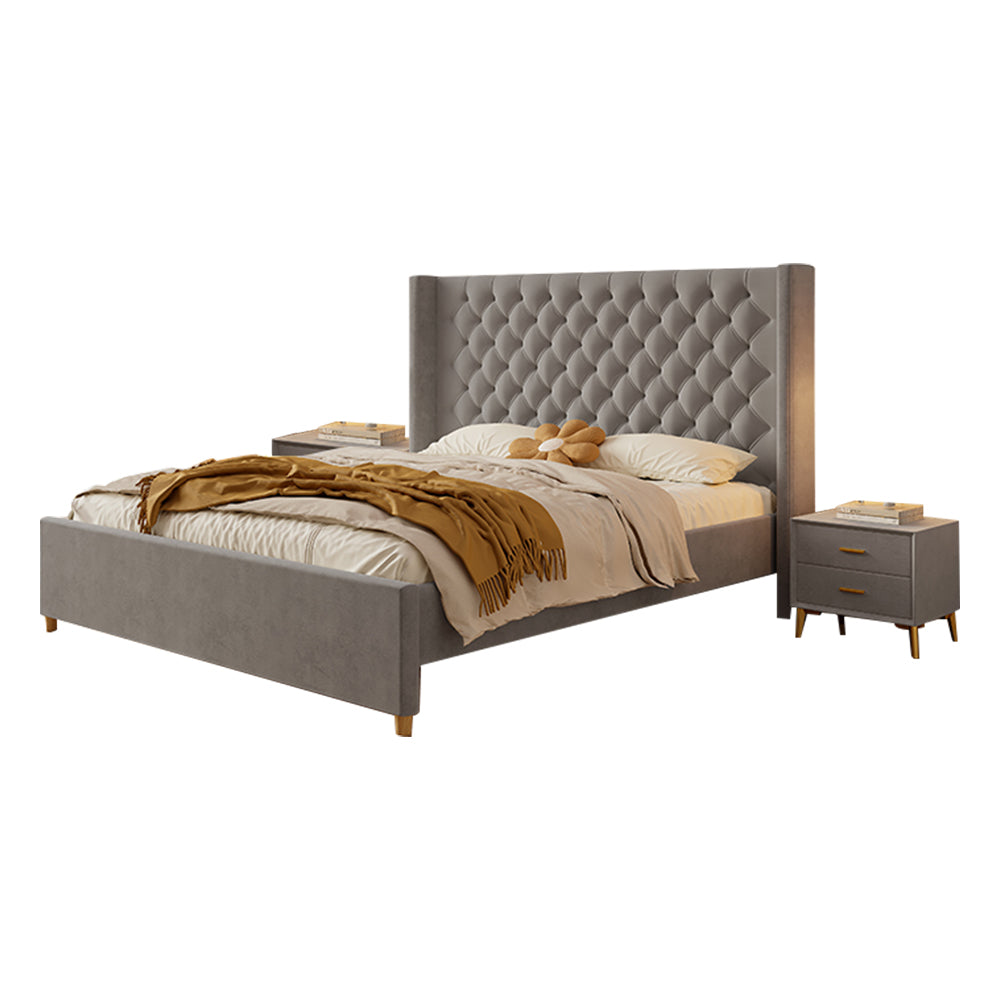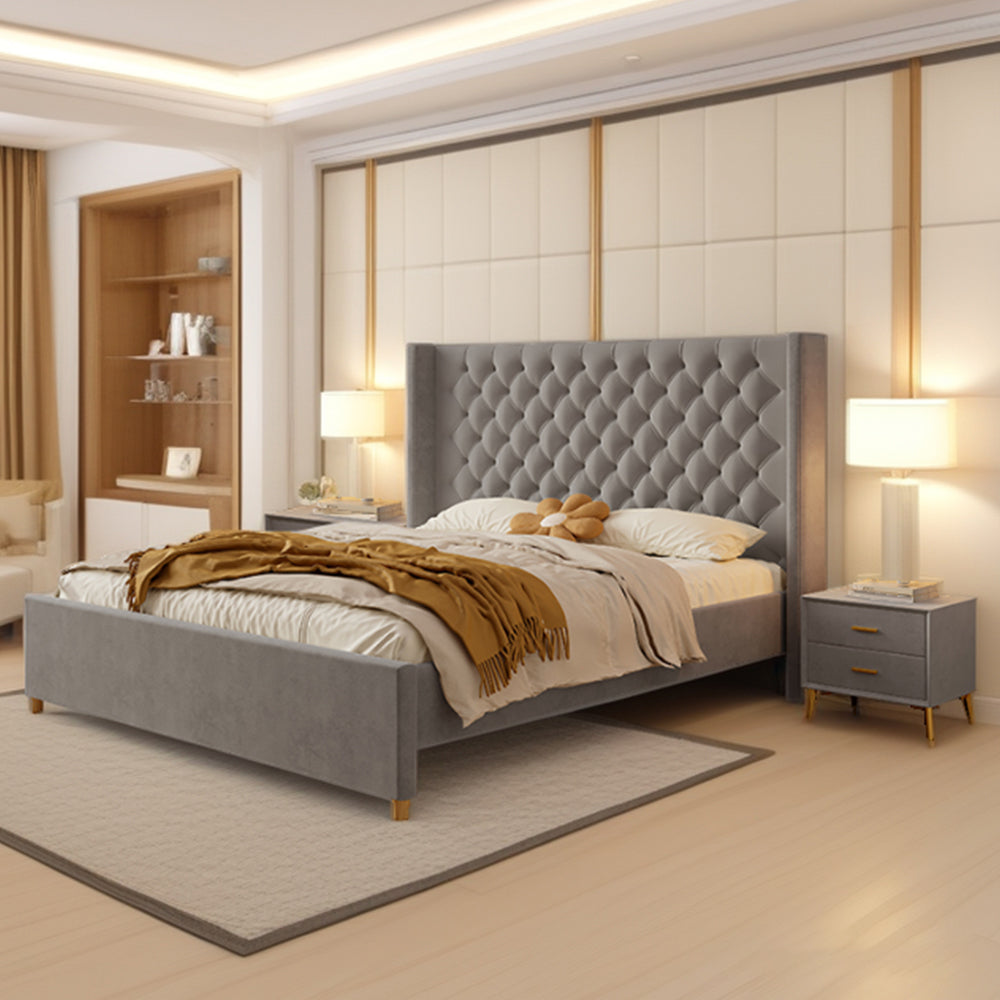 LIVARA SM1907 150/180cm Velvet Fabric Bed With Two Bedside Tables - Grey