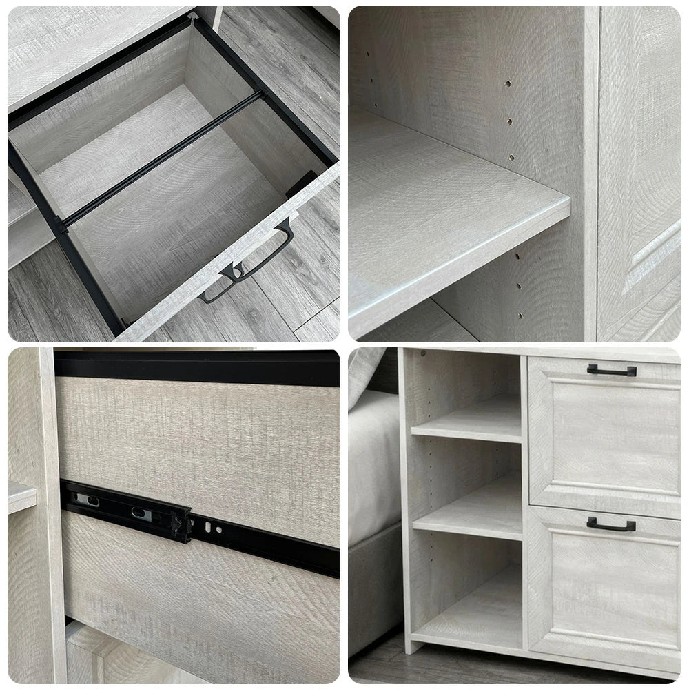 LIVARA 111 Modern Lateral Filing Cabinet, Two Drawers with Hanging Bars, Open Shelves for Storage, Brass Handles, MDF Structure, Home Office Organizer - Grey