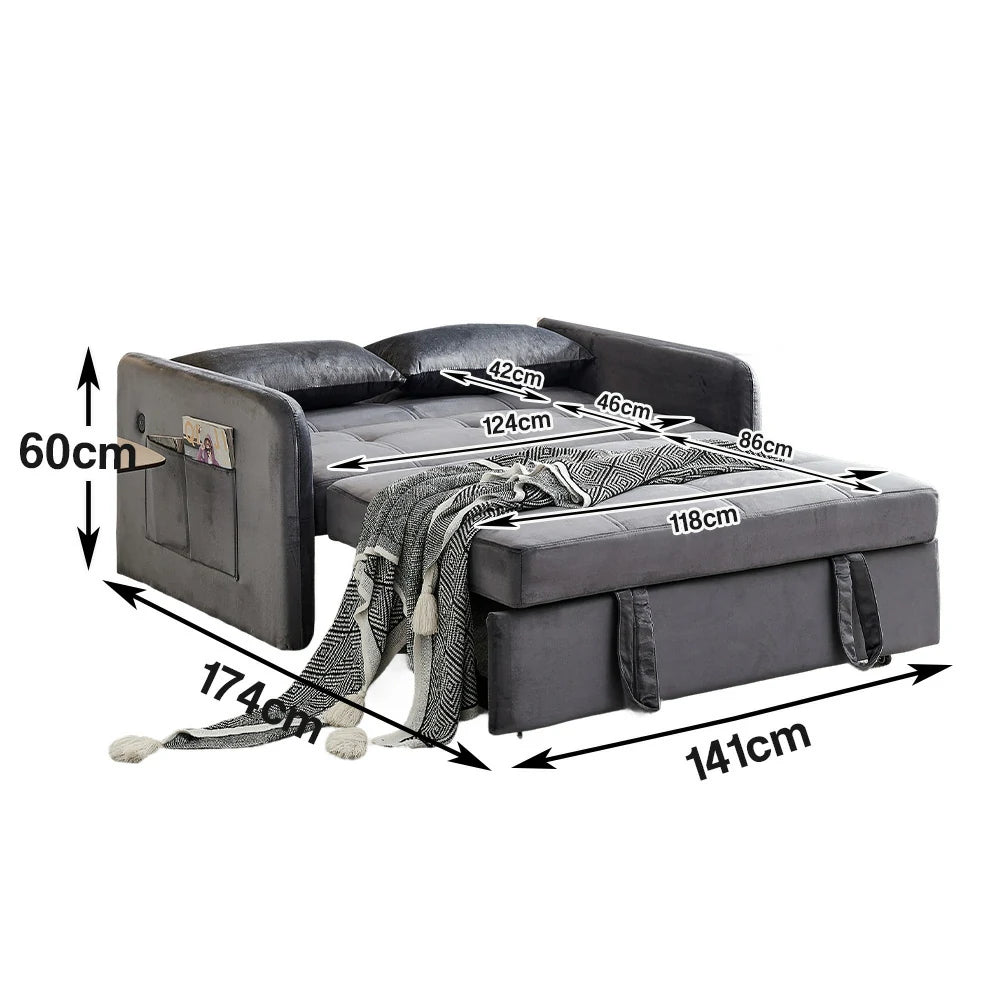 LIVARA 117 Convertible Velvet Sofa Bed, Adjustable Backrest, Built-in USB Charging Port, Twin Size Sleeper, Modern Small-Space Design - Grey
