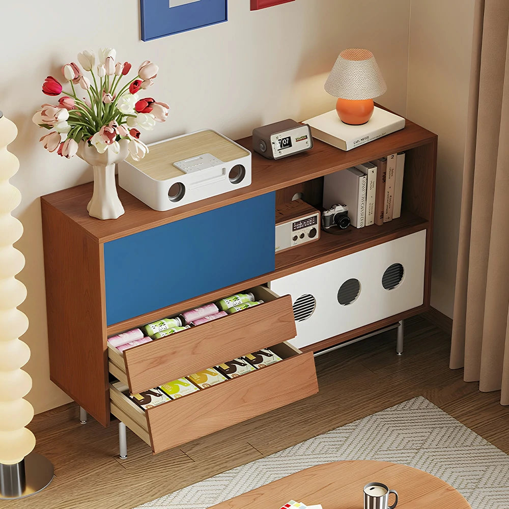 LIVARA 8815 Solid Wood Storage Cabinet, Dual Sliding Doors, Rubberwood with Cherry Veneer, Soft-Close Drawers, Stainless Steel Legs, Spacious Design - Wood and Blue