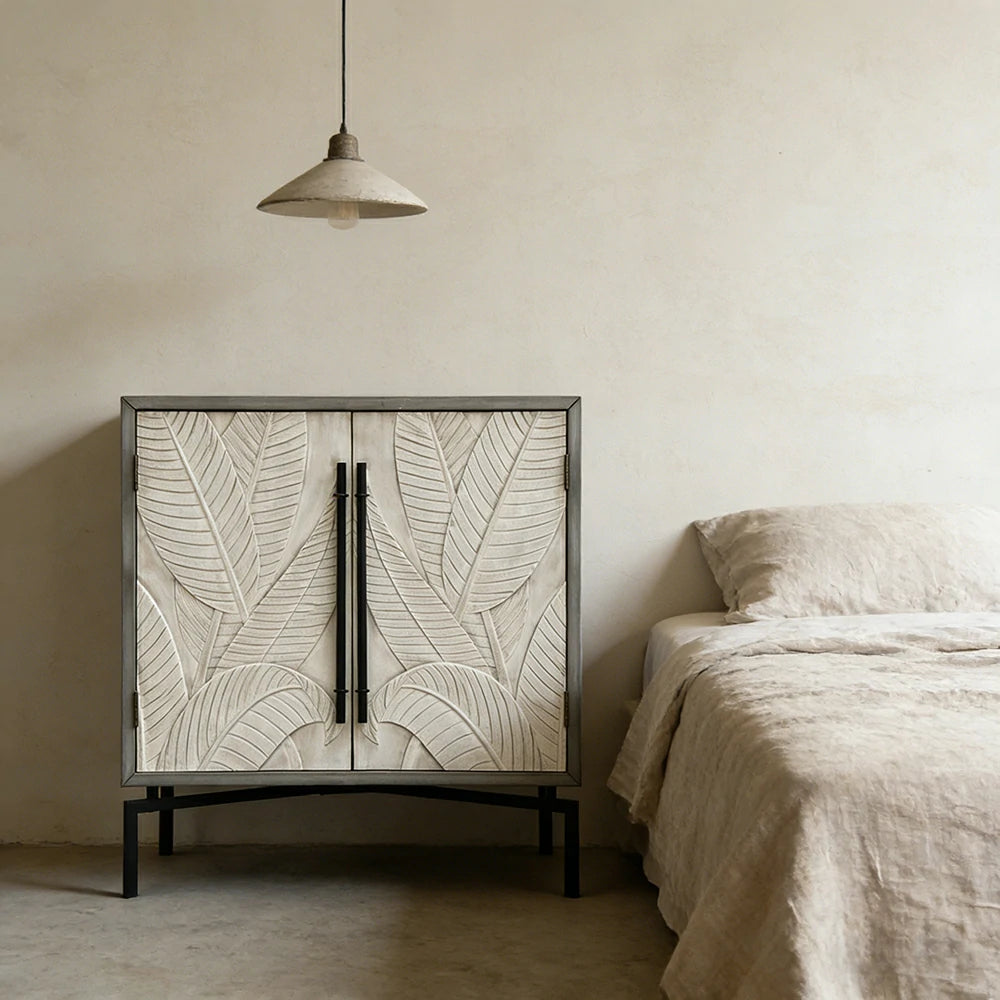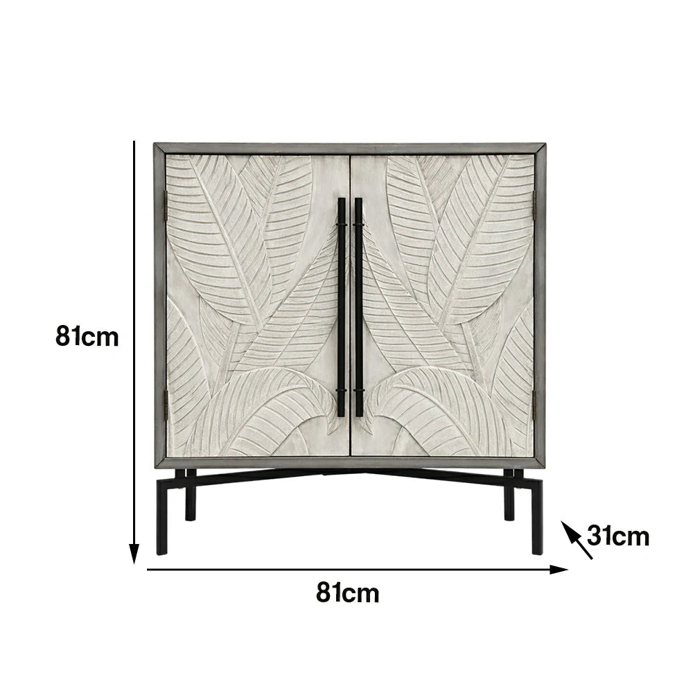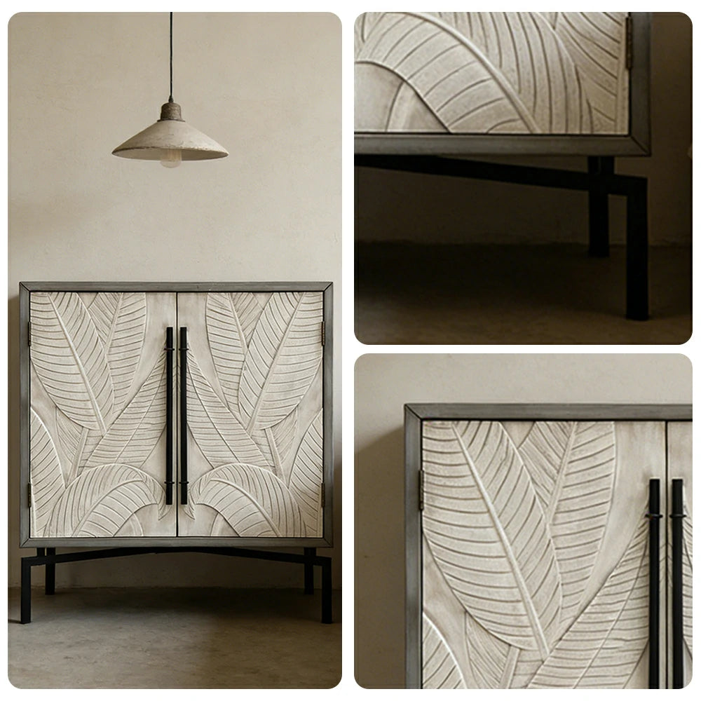 LIVARA Vintage Carved Leaf Storage Cabinet with Metal Legs Solid Spruce Wood MDF Distressed Decorative Sideboard