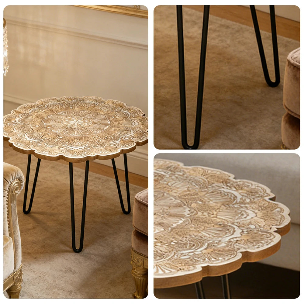 LIVARA Vintage Carved Coffee Table Solid Wood Top Metal Hairpin Legs Floral Designer Accent Table