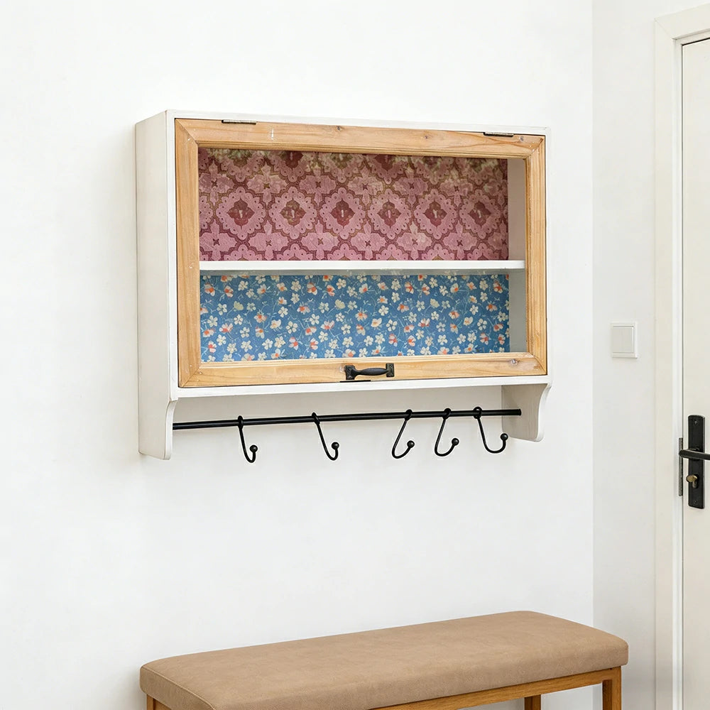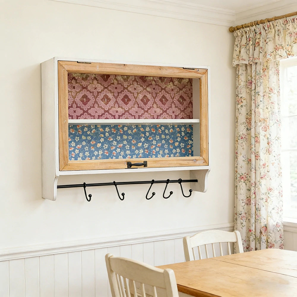 LIVARA Vintage Wall Cabinet Glass Sliding Door Storage Solid Fir Wood Rustic Country Display Shelf with Hook Rail