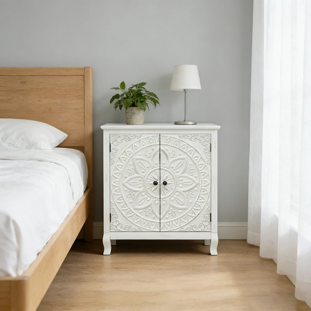 LIVARA Vintage Carved Storage Cabinet Double Door Sideboard Solid Wood MDF Distressed White Floral Decorative Furniture