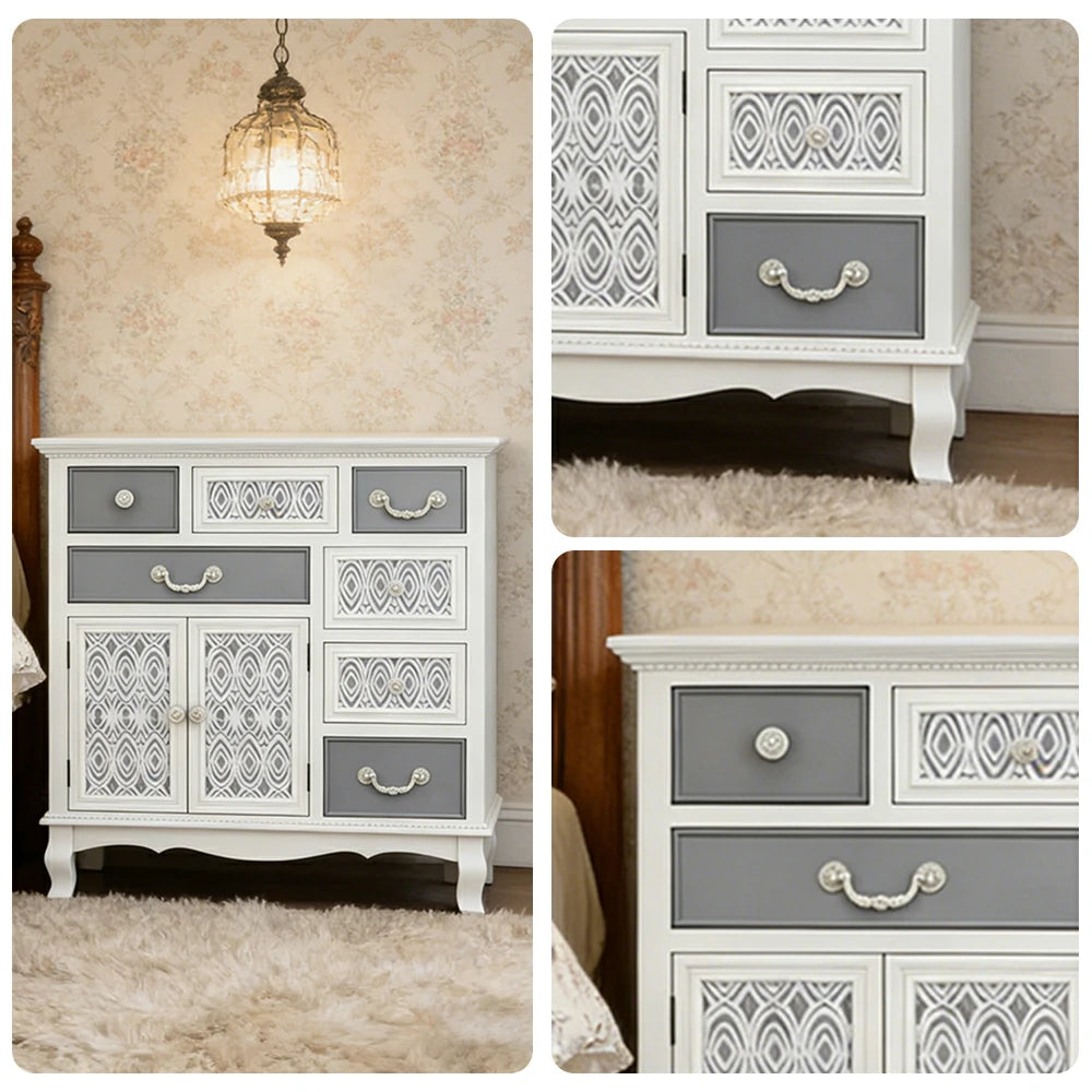 LIVARA Vintage Carved Storage Cabinet Multi Drawer Sideboard Solid Wood MDF Distressed White Grey Decorative Furniture