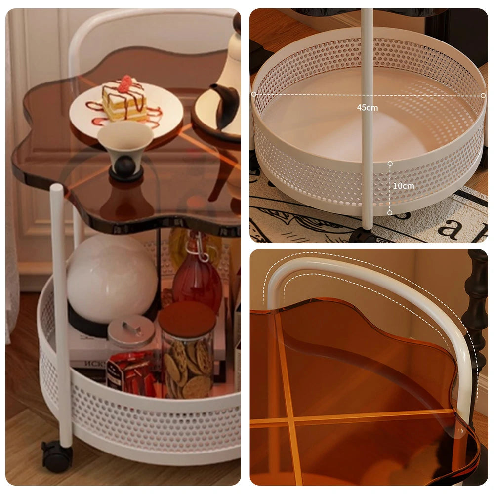 LIVARA Bedside Storage Table, Petal-Shaped Design, Tempered Glass Top, Dual-Tier Storage with Lockable Wheels - Brown