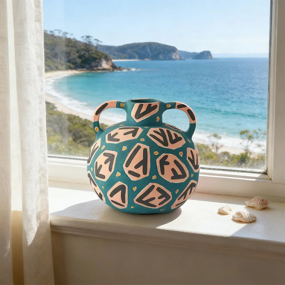 LIVARA Rune Ceramic Vase - Sculptural Double-Handle Design with Hand-Painted Symbol Pattern, Handcrafted Artistic Decor for Modern Interiors - Green