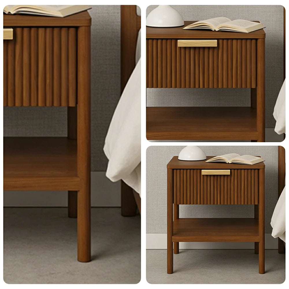 LIVARA Solid Wood Bedside Table - Drawer and Open Shelf Storage, Vertical Slatted Design, Elevated Legs, Natural Timber Grain - Walnut