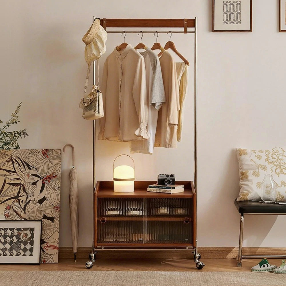 LIVARA 1121 Freestanding Clothes Rack, Multi-Functional Storage & Clothing Stand, Solid Wood & Stainless Steel, Glass Door & Swivel Casters - Wood