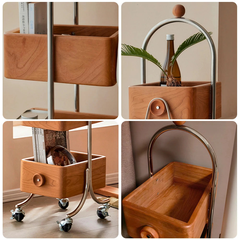 LIVARA 1126 4-Tier Mobile Bookshelf – Multi-Functional Solid Wood & Stainless Steel Frame, Swivel Wheels with Locking Function-Wood