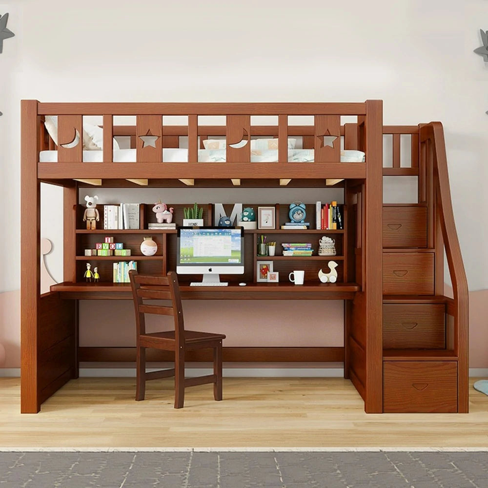 LUXORA Multifunctional Bunk Bed 120/135/150cm Eco-Friendly Solid Wood, Built-in Desk with Bookshelf, Extra Storage Cabinet, Wide Safe Ladder - Brown