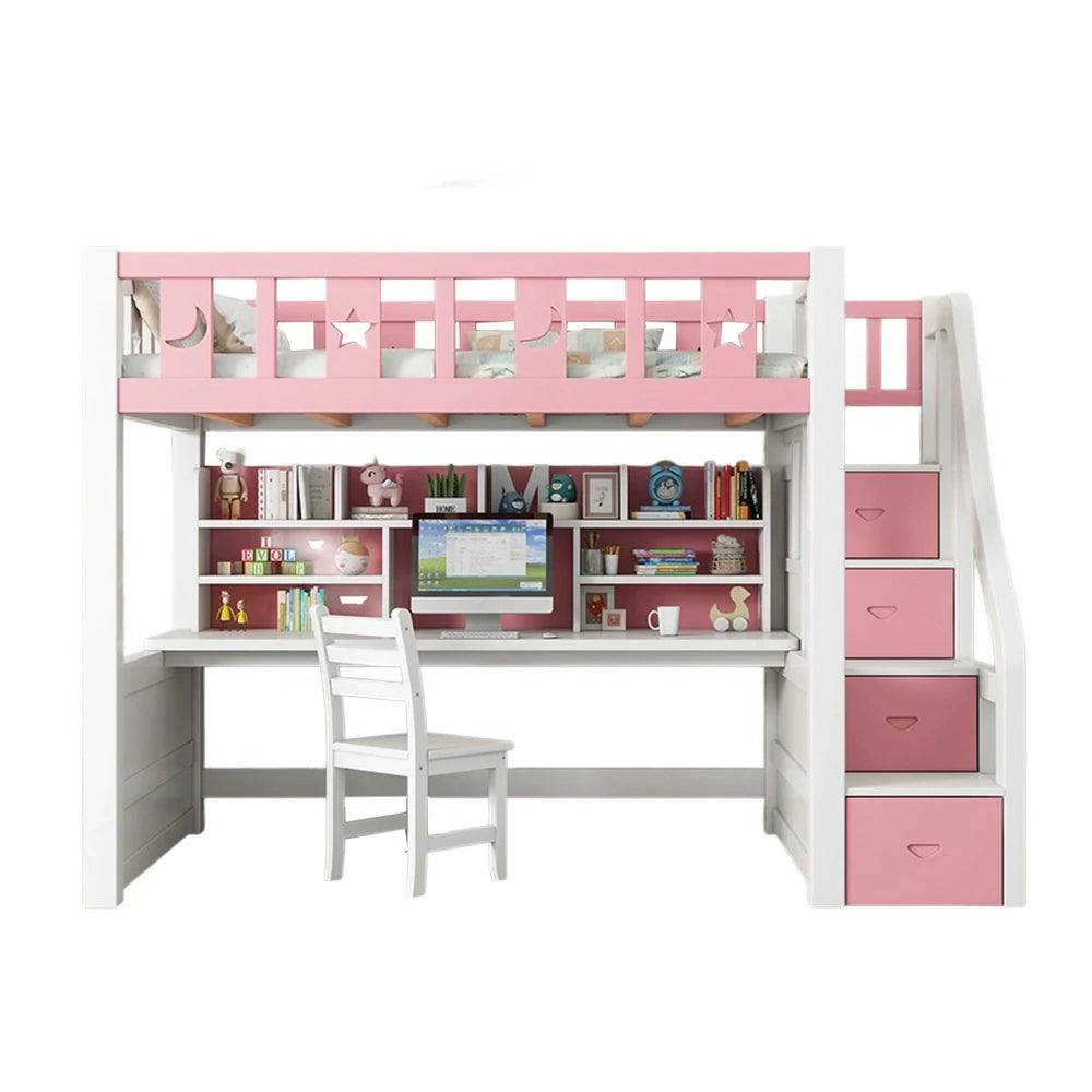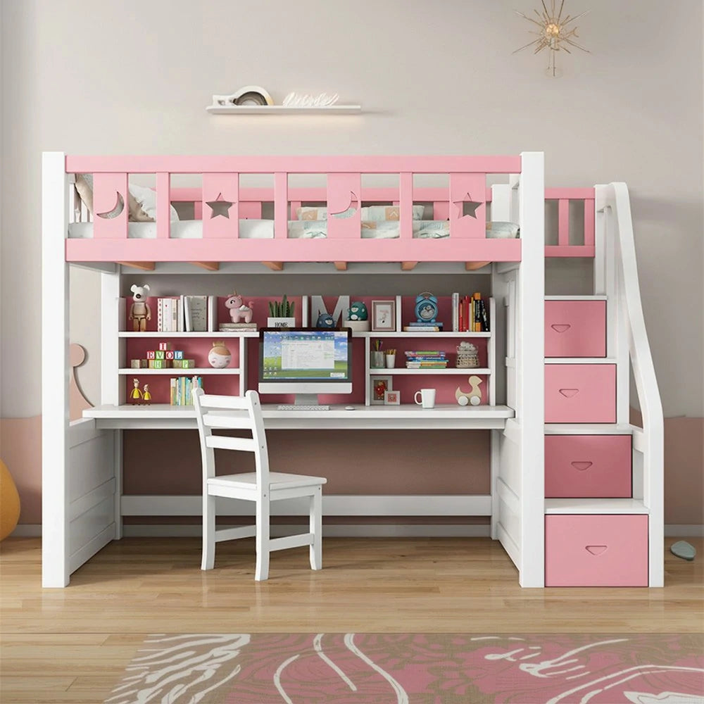LUXORA Multifunctional Bunk Bed 120/135/150cm Eco-Friendly Solid Wood, Built-in Desk with Bookshelf, Extra Storage Cabinet, Wide Safe Ladder - Pink