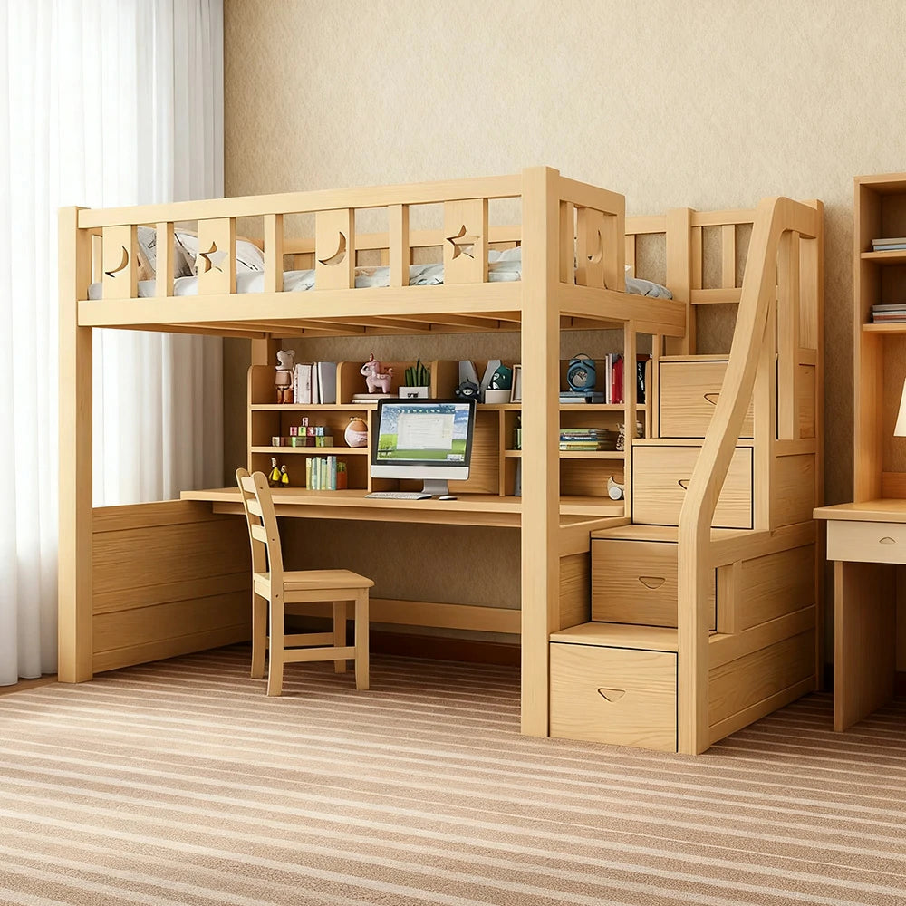 LUXORA Multifunctional Bunk Bed 120/135/150cm Eco-Friendly Solid Wood, Built-in Desk with Bookshelf, Extra Storage Cabinet, Wide Safe Ladder - Wood
