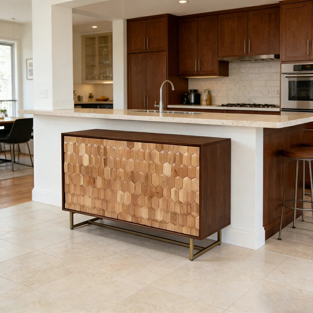 LUXORA 120/140cm Wooden Sideboard Cabinet - Hexagonal Door Design, Large Enclosed Storage, Natural Timber Panels, Elevated Metal Base