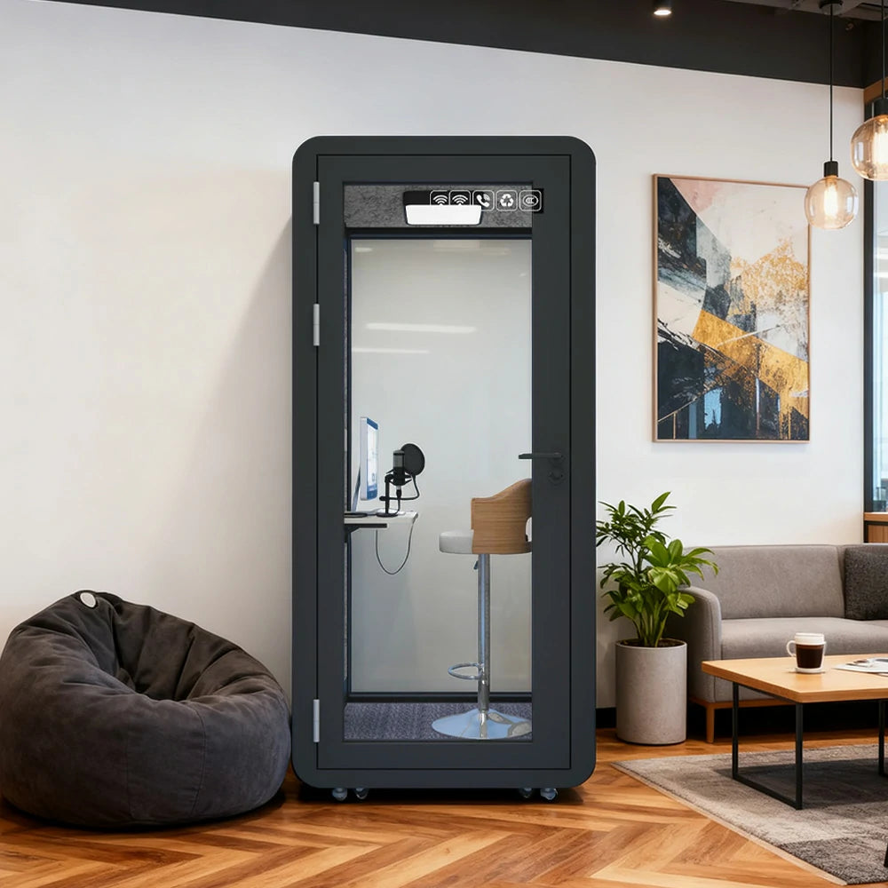 MODERA MWK-101021 Wood Grain 1.0x1.0m Soundproof Office Meeting Booth w/ Lighting, Ventilation & Casters - Black