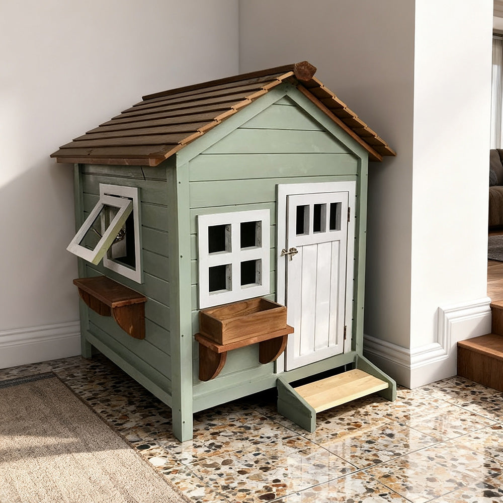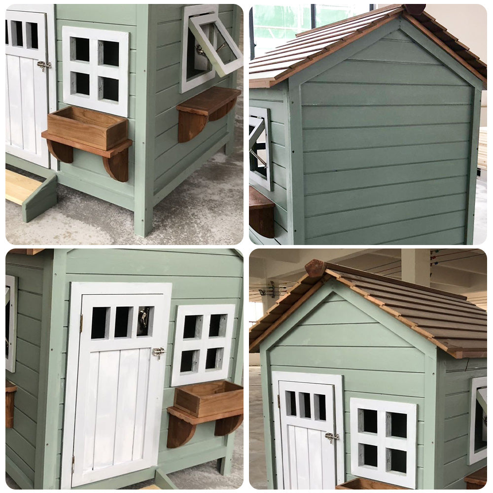 PAWORA Outdoor Cat House - Fir Wood, Waterproof Roof, Scratch & Moisture Resistant, Ventilated Design, All-Season Pet Shelter - Green