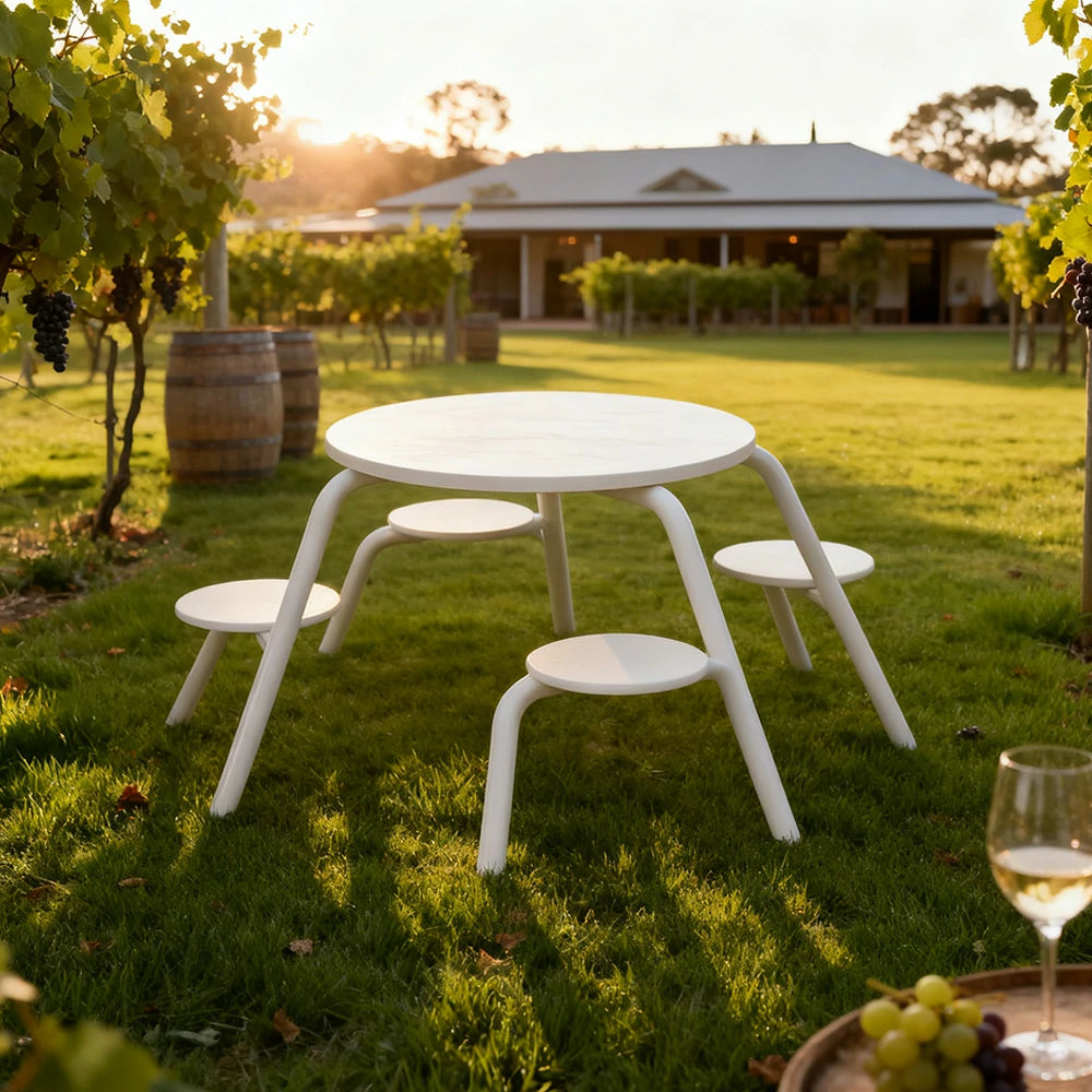 SOLARA Carbon Steel Table & Chair Set 3/4-Seater Ergonomic One-Piece Design High-Temp Coated Finish Stable Load-Bearing Structure - White