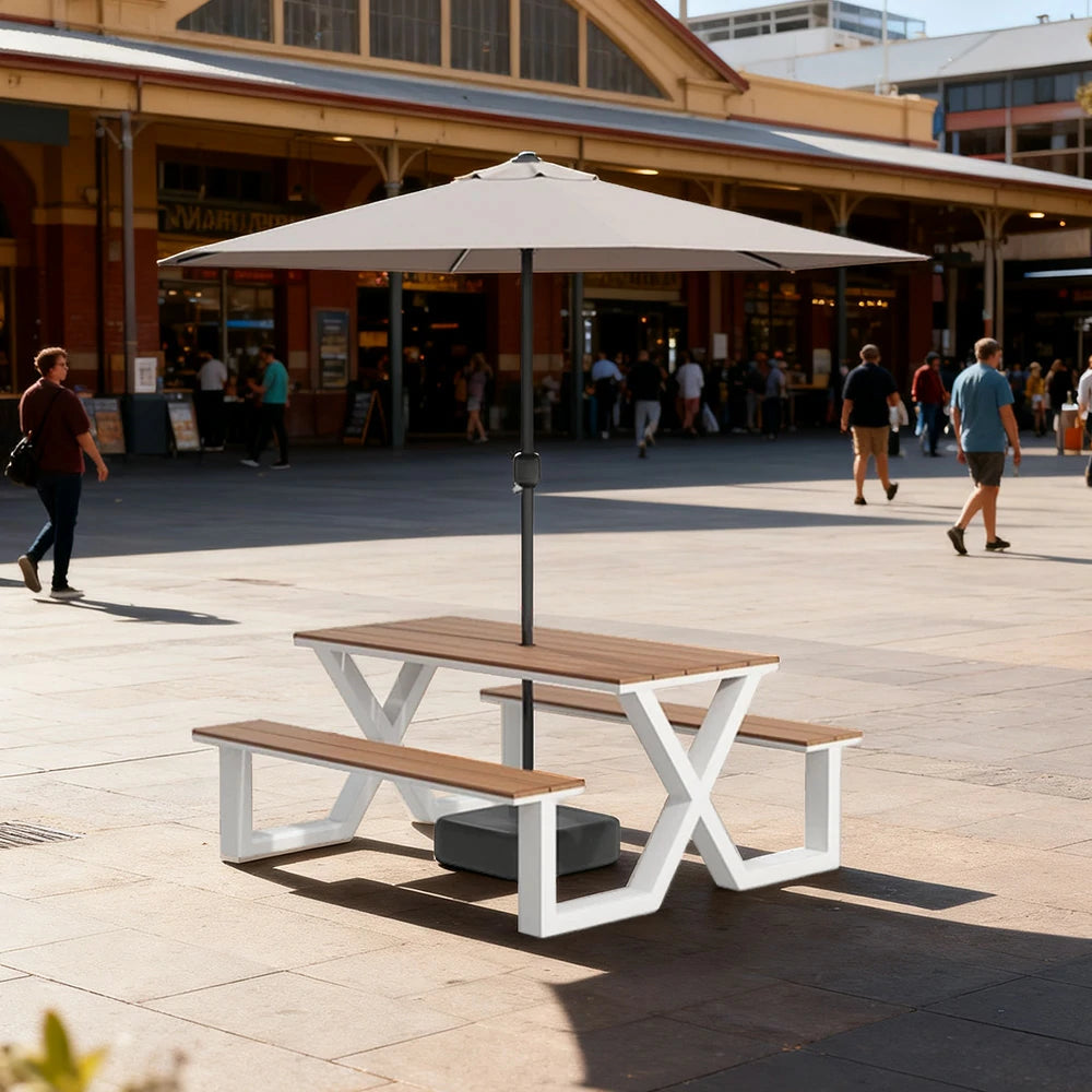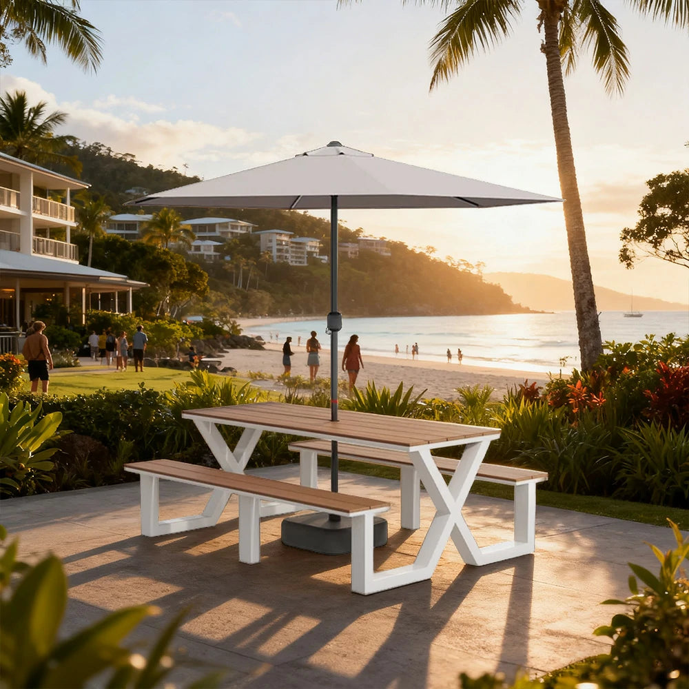 SOLARA Outdoor Table, Chair & Umbrella Set 120/160/200cm Waterproof Sun-Resistant Plastic-Wood Surface Carbon Steel Frame Stable Anti-Corrosion Design - White