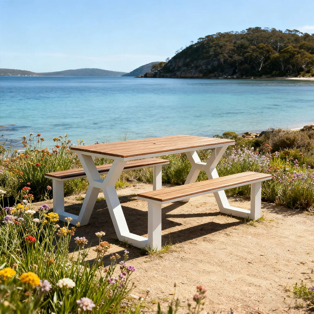 SOLARA Outdoor Table & Chair Set 120/160/200cm Eco-Friendly Waterproof Sunproof Plastic-Wood Surface Durable Anti-Oxidation Steel Frame - White