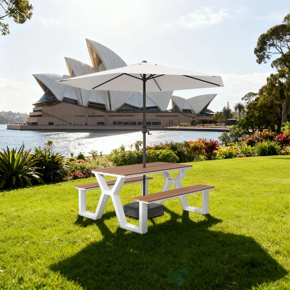 SOLARA Outdoor Table, Chair & Umbrella Set 120/160/200cm Eco-Friendly Waterproof Sunproof Plastic-Wood Surface Durable Anti-Oxidation Steel Frame - White