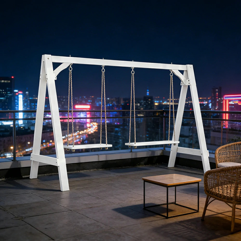 SOLARA 125/212/263cm Outdoor Swing Set Triangular Frame Solid Pine Wood ACQ Treated Heavy-Duty Rope Support - White
