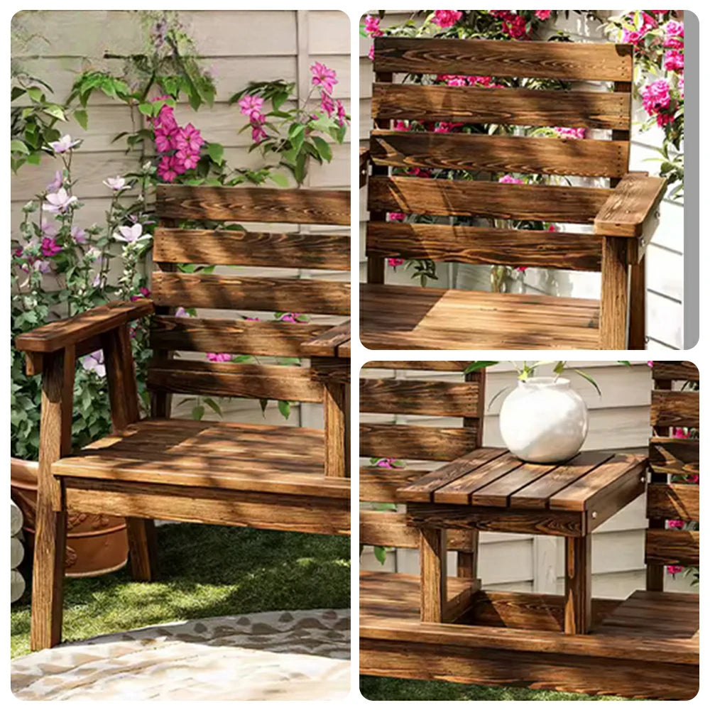 SOLARA Solid Wood Two-Seater Bench Chair with Integrated Centre Table - Seamless Full-Panel Timber Design, Thickened Reclined Backrest - Brown