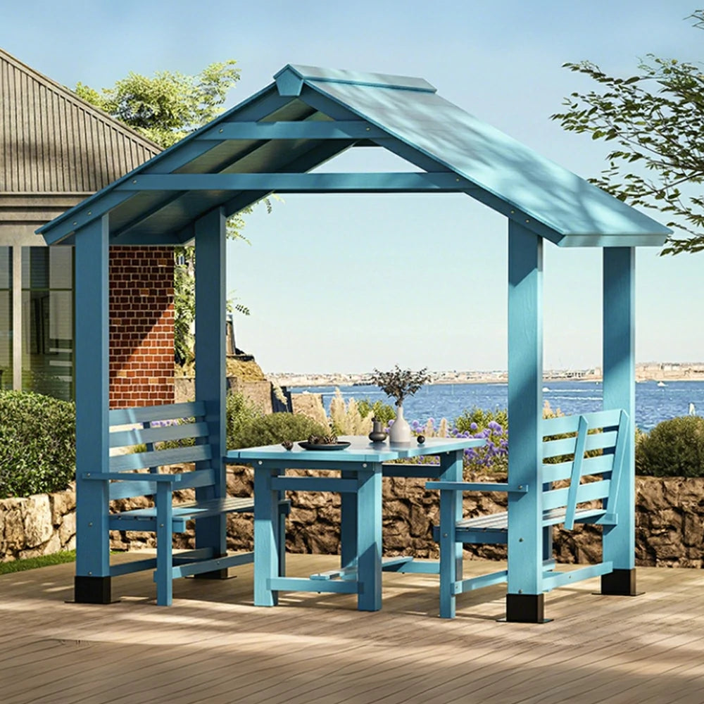 SOLARA Outdoor Pavilion - Heavy-Duty Solid Wood Frame with Double Chairs & Center Table, Durable Sunshade Canopy Garden Gazebo - Blue