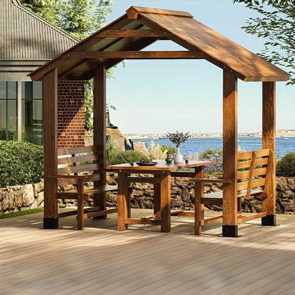SOLARA Outdoor Pavilion - Heavy-Duty Solid Wood Frame with Double Chairs & Center Table, Durable Sunshade Canopy Garden Gazebo - Yellow